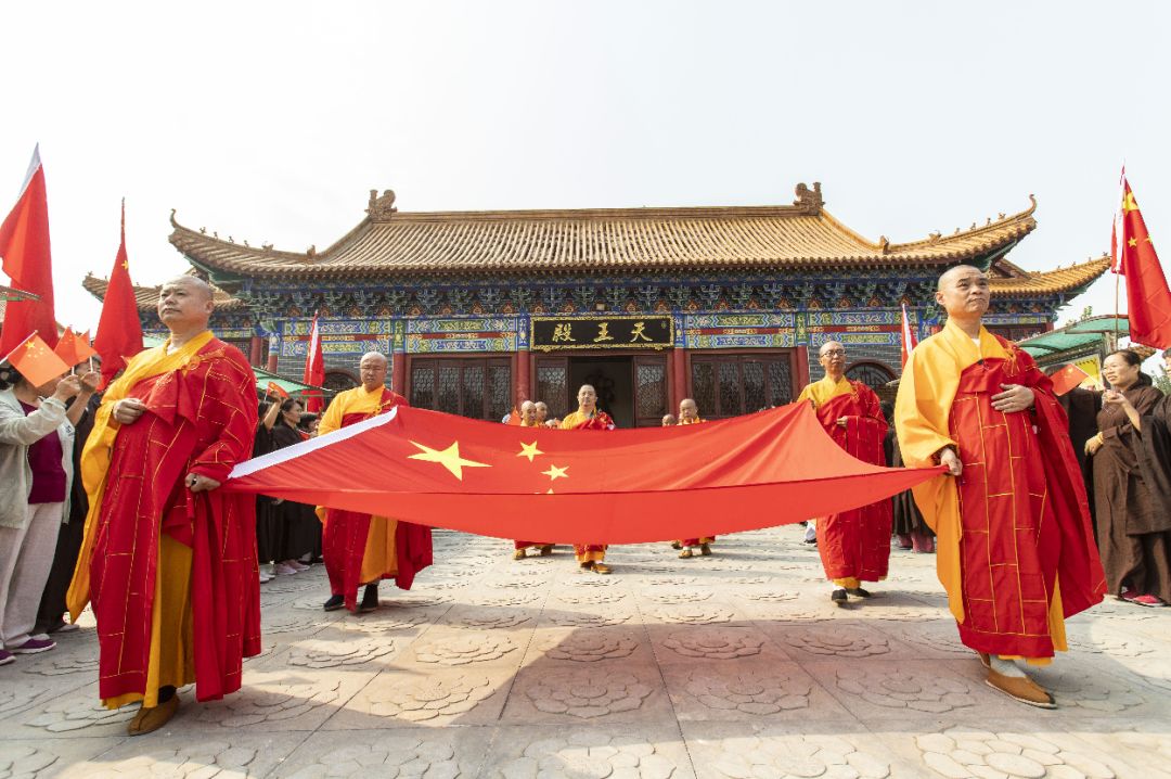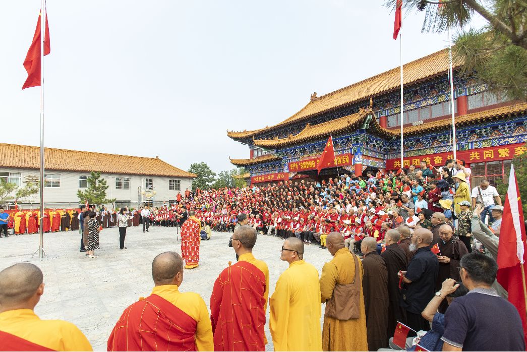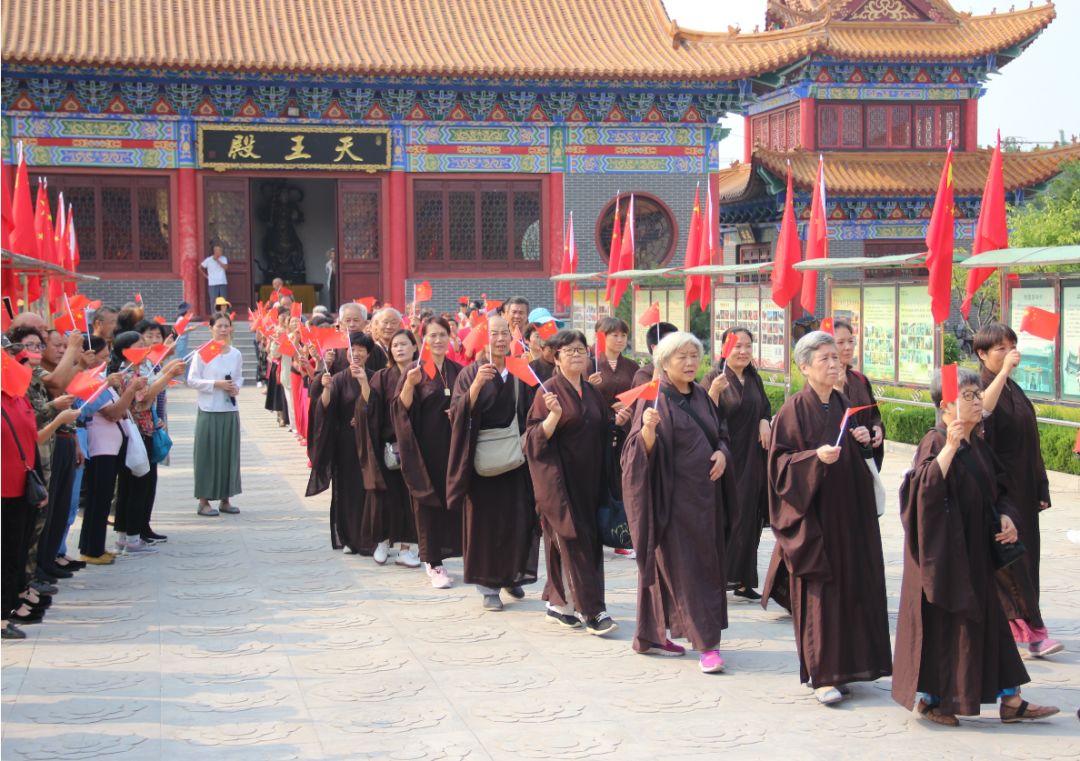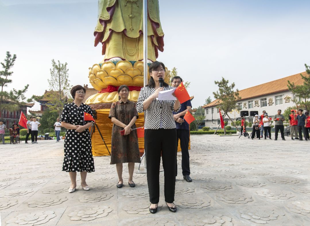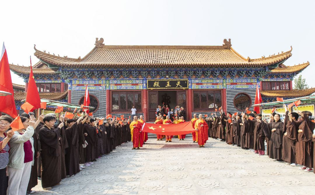 为庆祝新中国成立70周年,弘扬以爱国主义为核心的伟大民族精神,增强文化自信,增强华严寺与信众的国家意识和爱国情感。淄博桓台华严寺于9月1日在法雨楼广场前举行了升国旗、唱红歌等爱国主题活动。桓台县委常委、统战部部长王润芹及桓台县委统战部常务副部长杨磊、田庄镇党委书记刘春霞等相关领导共同出席了此次爱国活动。上午九点半,活动开始。华严寺住持常净大和尚率常住法师、寺院义工及居士们在法雨楼广场前举行隆重升国旗仪式。全体僧众着装整齐,列队站立,在嘹亮的国歌声中,目视五星红旗冉冉升起,祈愿世界和平、国家富强。