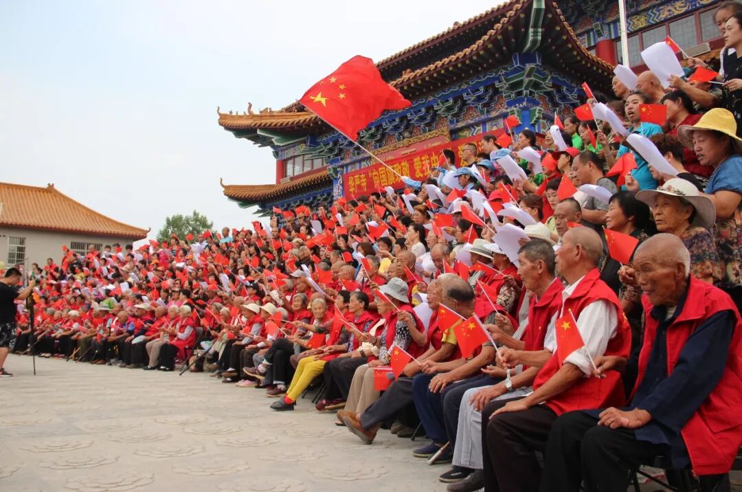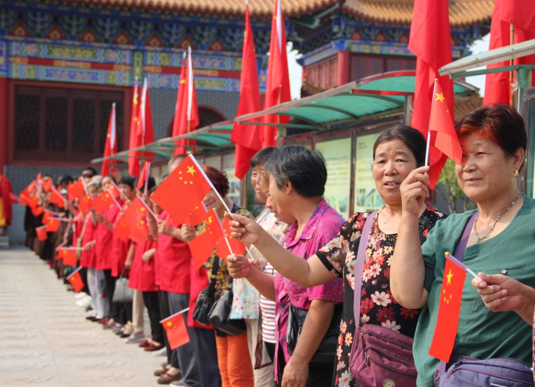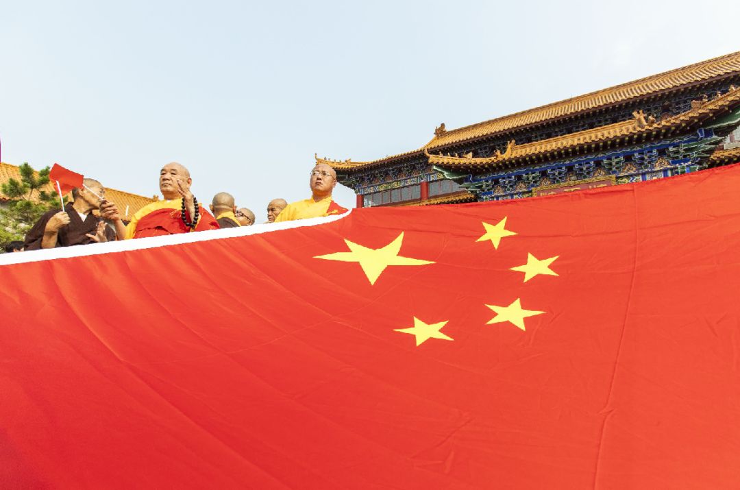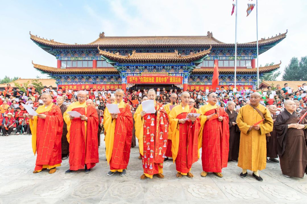 为庆祝新中国成立70周年,弘扬以爱国主义为核心的伟大民族精神,增强文化自信,增强华严寺与信众的国家意识和爱国情感。淄博桓台华严寺于9月1日在法雨楼广场前举行了升国旗、唱红歌等爱国主题活动。桓台县委常委、统战部部长王润芹及桓台县委统战部常务副部长杨磊、田庄镇党委书记刘春霞等相关领导共同出席了此次爱国活动。上午九点半,活动开始。华严寺住持常净大和尚率常住法师、寺院义工及居士们在法雨楼广场前举行隆重升国旗仪式。全体僧众着装整齐,列队站立,在嘹亮的国歌声中,目视五星红旗冉冉升起,祈愿世界和平、国家富强。